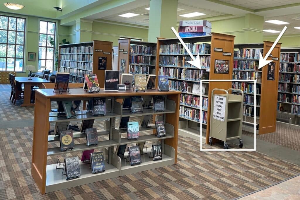 (Note to readers: If you’ve picked up a library book and decide not to check it out, look around to see if there’s a book cart nearby. Often there will be a sign asking you to return books to these carts instead of reshelving them yourself. Please use these carts! It makes the staff’s jobs easier and helps keep the collection organized.)